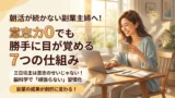 コツは、前日の夜に準備を完了させておくことです。「机の上にノートを開いておく」「パソコンをスリープ状態にしておく」など、起きて0秒で作業に入れる環境を作ってから寝ましょう。また、寝る90分前からはスマホを見ないことも大切です。ブルーライトは睡眠の質を下げ、翌朝の目覚めを悪くしてしまいます。